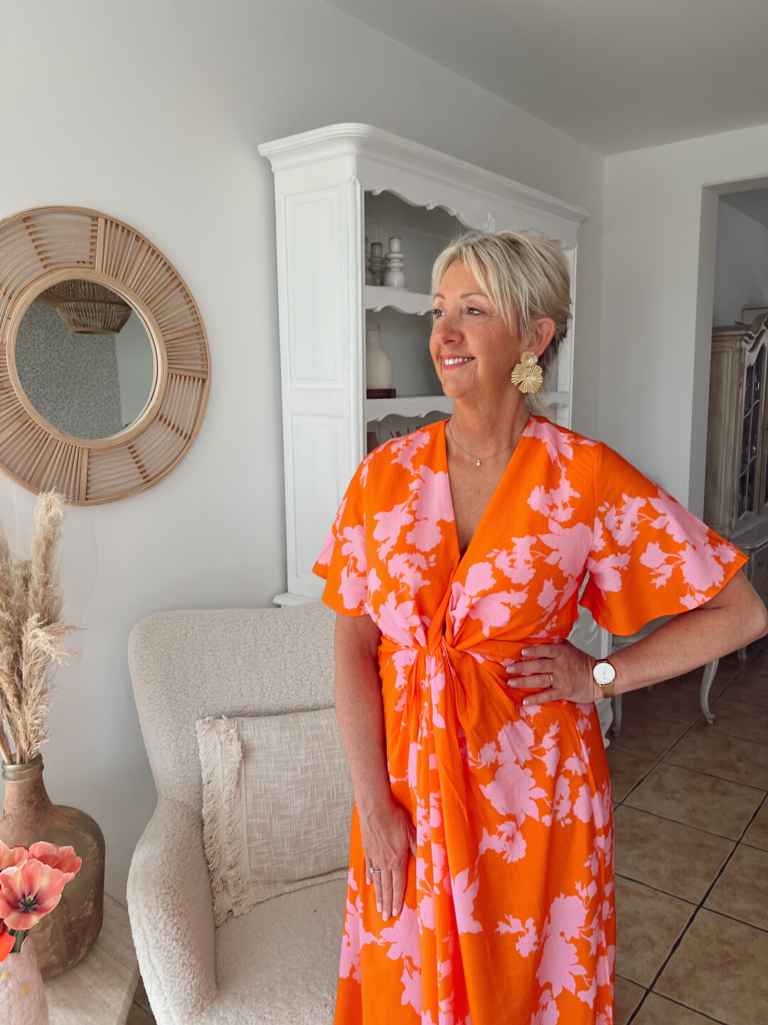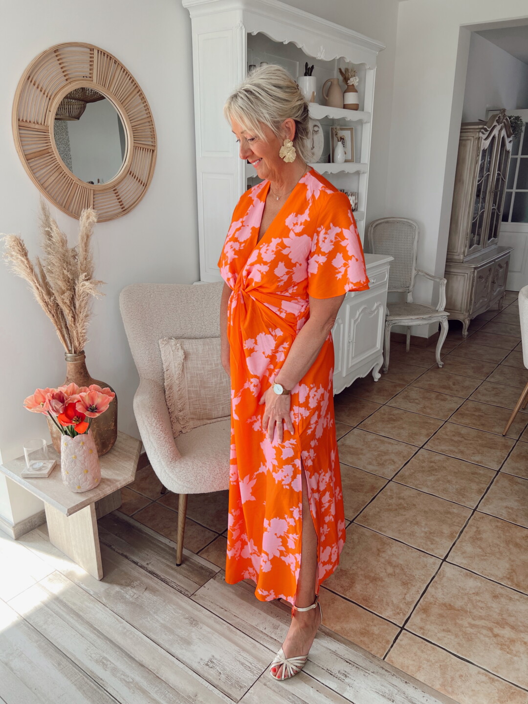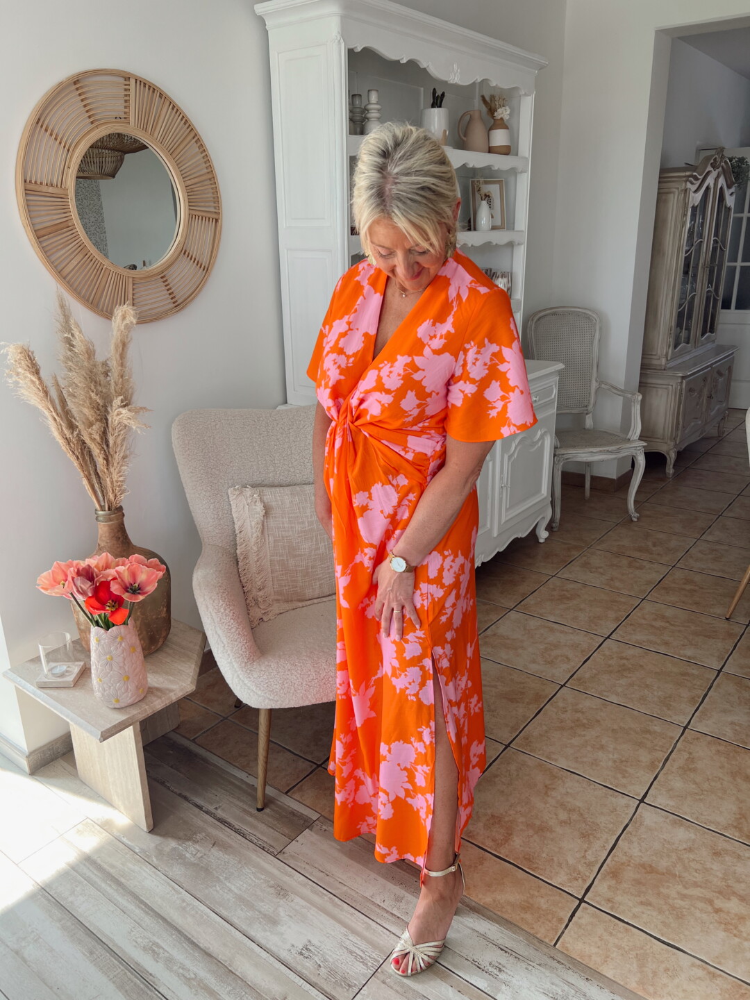 Avec ses teintes orange et rose, cette robe apporte une touche de fraîcheur et de modernité à votre garde-robe. Son design fluide met en valeur toutes les morphologies, tout en garantissant une allure chic et décontractée.