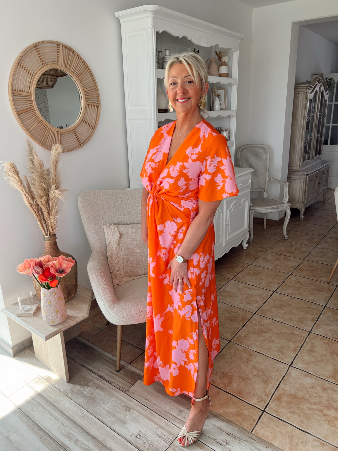 La robe Céleste orange et rose est la pièce incontournable pour sublimer votre silhouette avec simplicité et raffinement. Grâce à sa coupe longue et ses manches courtes, elle offre un parfait équilibre entre confort et élégance.