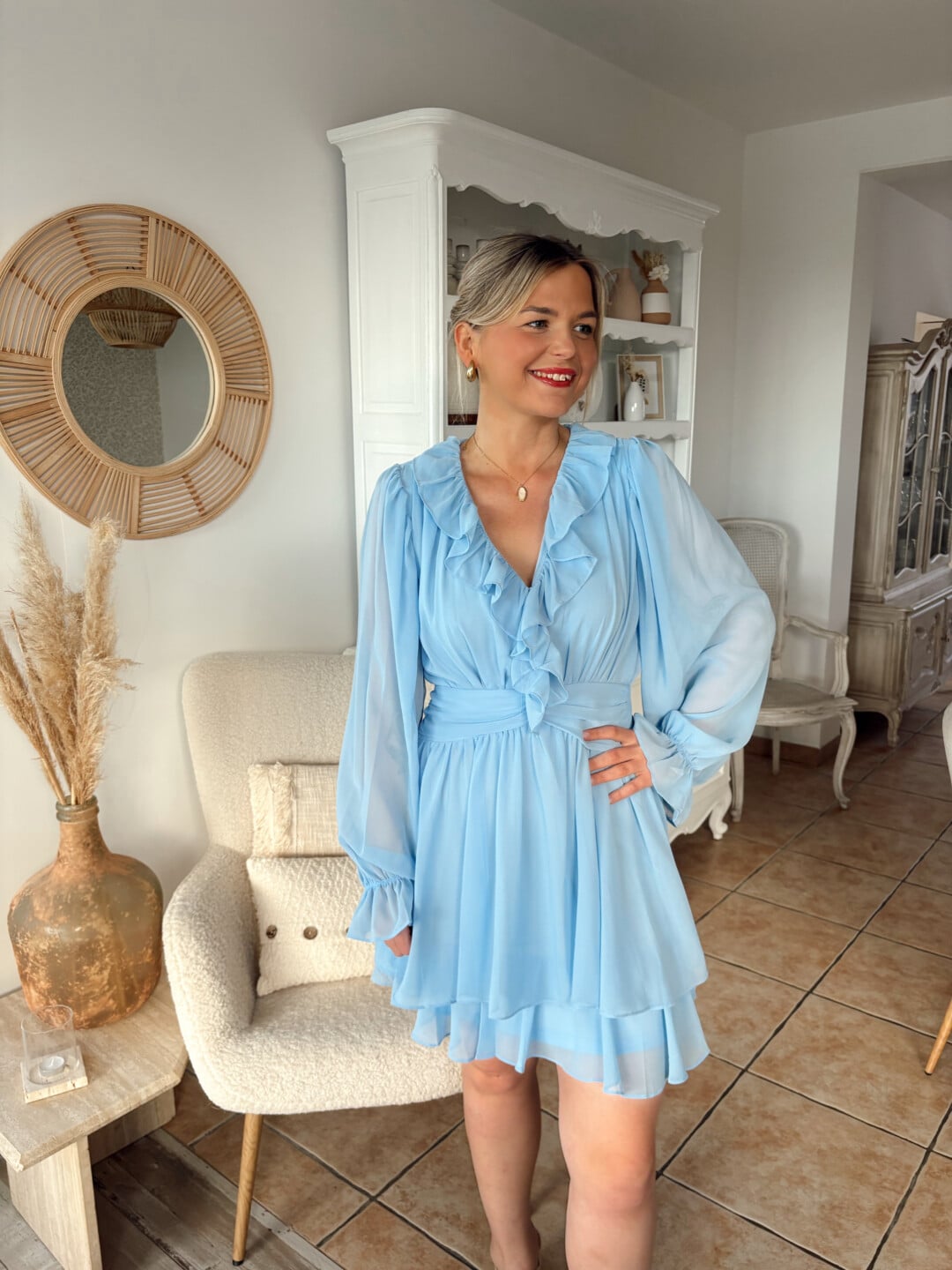 La robe Maurine bleue est la pièce parfaite pour apporter une touche de fraîcheur et de féminité à votre garde-robe. Sa coupe fluide et sa matière légère offrent un tombé naturel qui met en valeur la silhouette sans compromettre le confort.