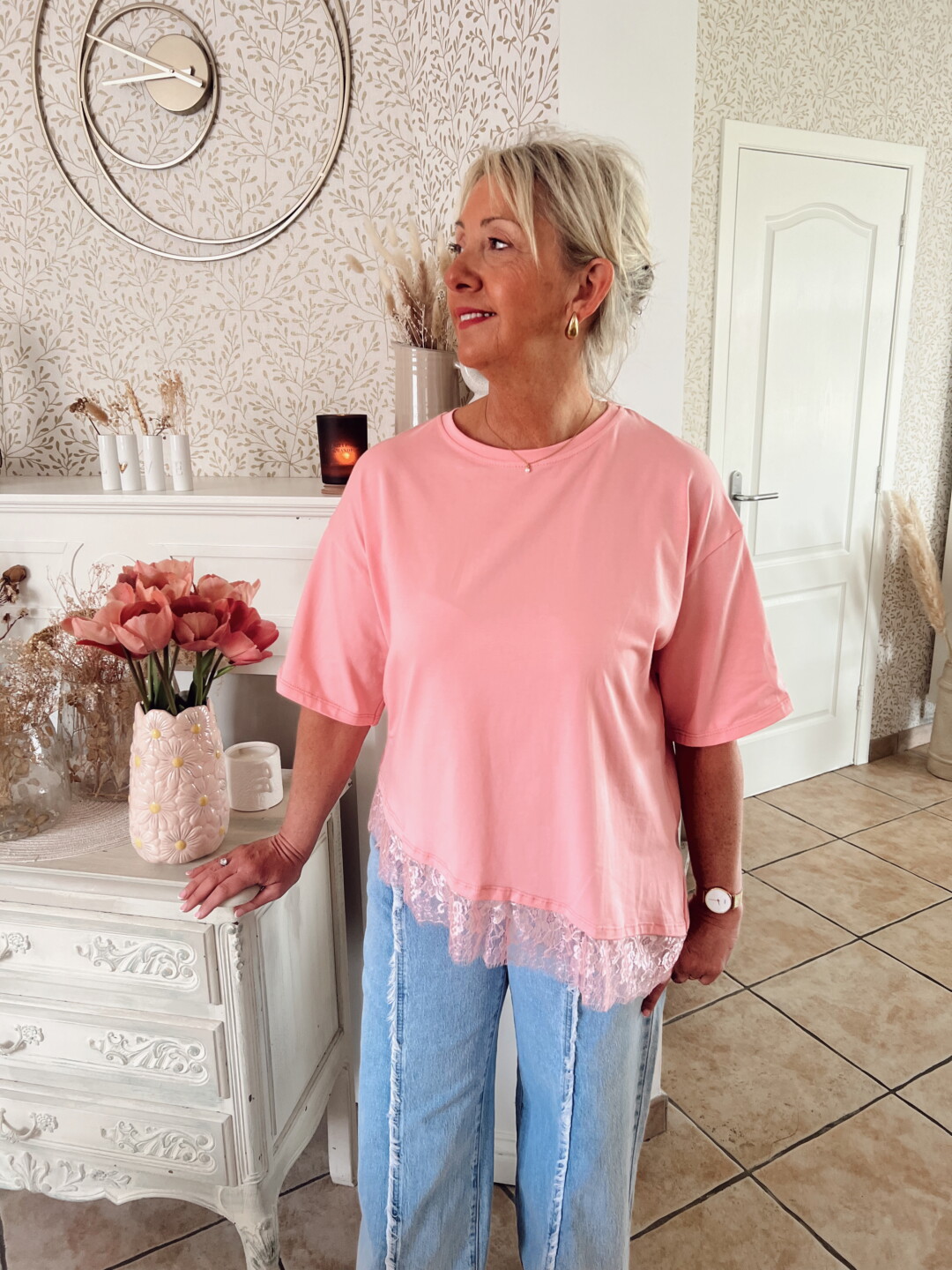La dentelle dans le bas apporte une touche délicate et élégante qui distingue ce T-shirt des modèles classiques. Le T-shirt Léa rose avec dentelle est parfait pour un style féminin, casual-chic et confortable à la fois.